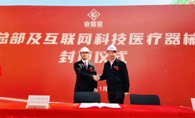 在封頂儀式上,業(yè)盛堂曾水泉董事長與南昌易醫(yī)研究院及山西澳邇藥業(yè)有限公司簽訂了戰(zhàn)略合作協(xié)議。