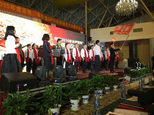 下午重頭戲是各省的風(fēng)采展以及莊嚴(yán)的授旗儀式,授旗是由公司董事長曾水泉先生將各省的團旗授予各省,希望各省以星星之火可以燎原之勢搶占市場擴大規(guī)模。