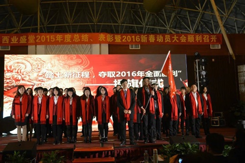 業(yè)盛堂2016聯(lián)歡晚會在莊嚴(yán)的國歌聲并伴隨著升旗儀式,聯(lián)歡晚會拉開帷幕。